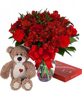 When you purchase this arrangement for 120.00...it will include a Medium Bear and a box of chocolates. Example: the 120.00 price is a 85.00 arrangement of red assorted flowers, with a medium bear and box of chocolates. Bow and heart pic included as shown.